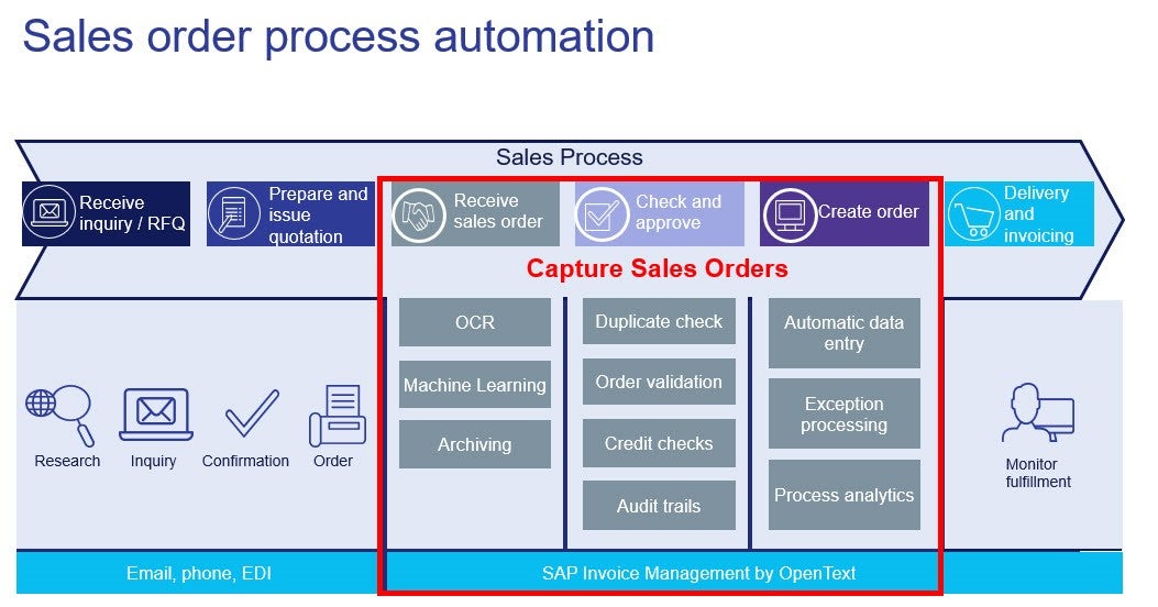 delaware Sales Order Automation is a preconfigured document capture solution that automates and accelerates customer order data entry processes, replacing a previously (human) error-prone process with an average automation success rate of up to 90% after just a few weeks of use. It is an end-to-end solution for the processing of business data and documents essential to your sales orders and seamlessly integrates with SAP GUI, Portal, FIORI.