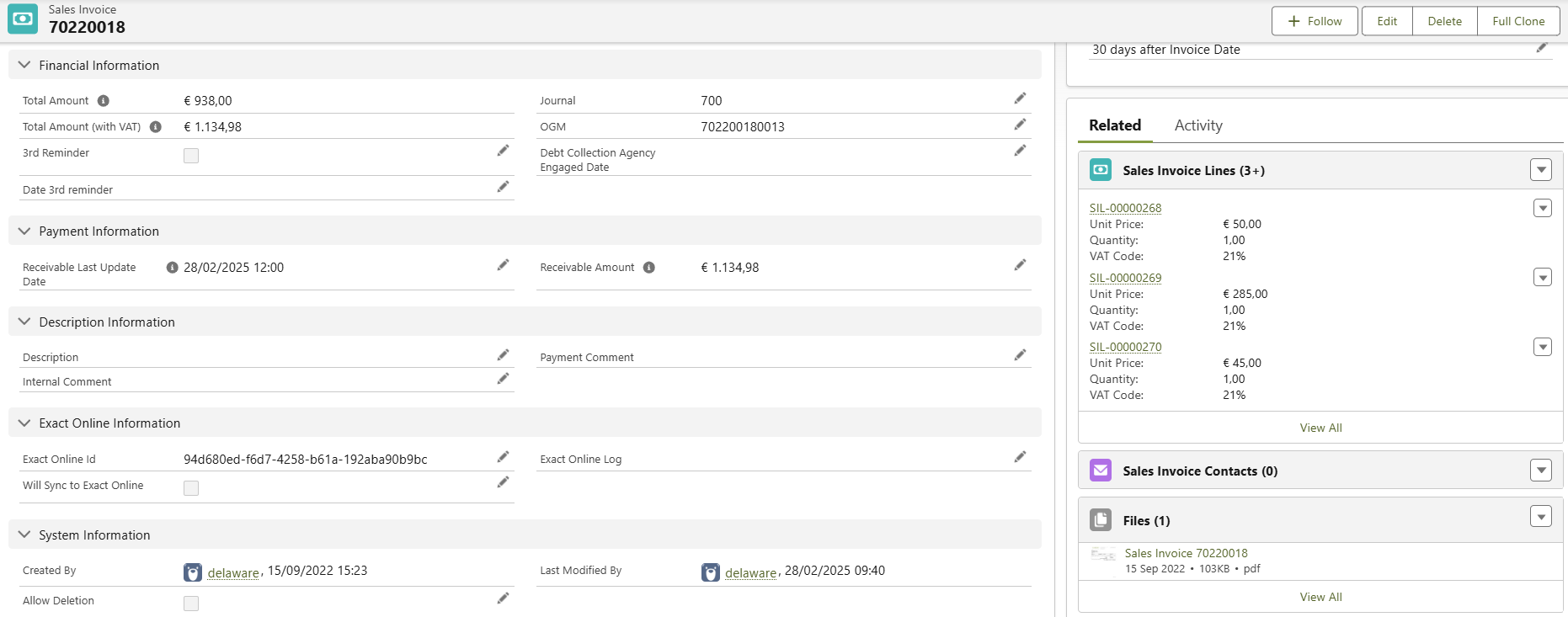 Typical use case is to synchronize Accounts and Invoices from Salesforce to Exact Online and retrieve the payment status of the invoices from Exact Online and write it back to Salesforce.