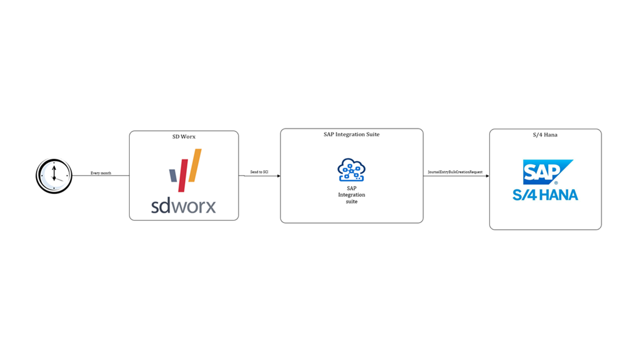 The integration between SD Worx and any SAP S/4HANA system (cloud or on-premise), streamlines the payroll accounting process by automating the creation of journal entries. Once the payment file (in CSV format) is ready for import, the integration ensures that journal entries are generated automatically on a monthly basis. This seamless connection eliminates manual data entry, enhances accuracy, and improves efficiency in payroll-related financial transactions. The solution provides businesses with a more reliable and time-saving approach to managing payroll data within their S/4HANA environment.