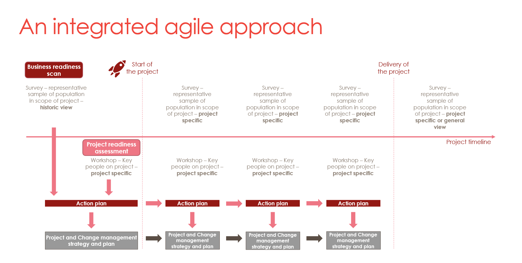 The business readiness scan is a survey that polls (a sample of) the people in the organization that are involved in an upcoming project and that have been involved in previous transformation projects on 6 key areas (LOOCKS): leadership, operational capability, organizational and change capability, communication, KPI's, strategy and vision.