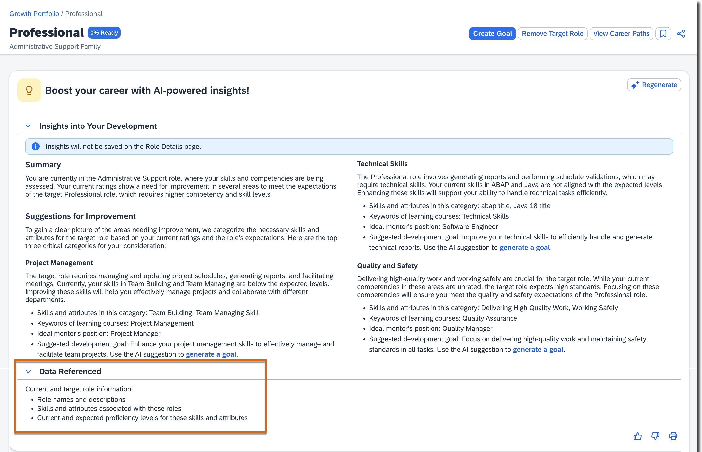 • Employees also benefit from AI-driven career insights that suggest mentors, development goals, and learning opportunities tailored to their role.