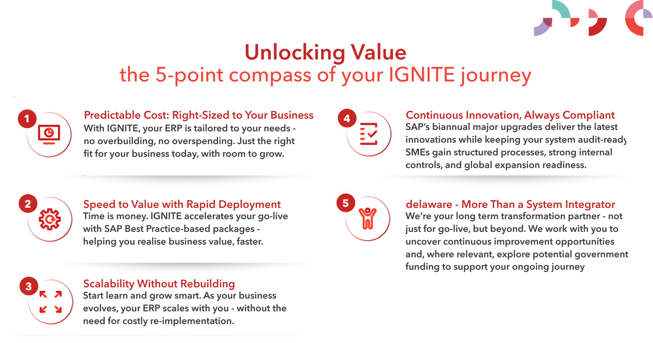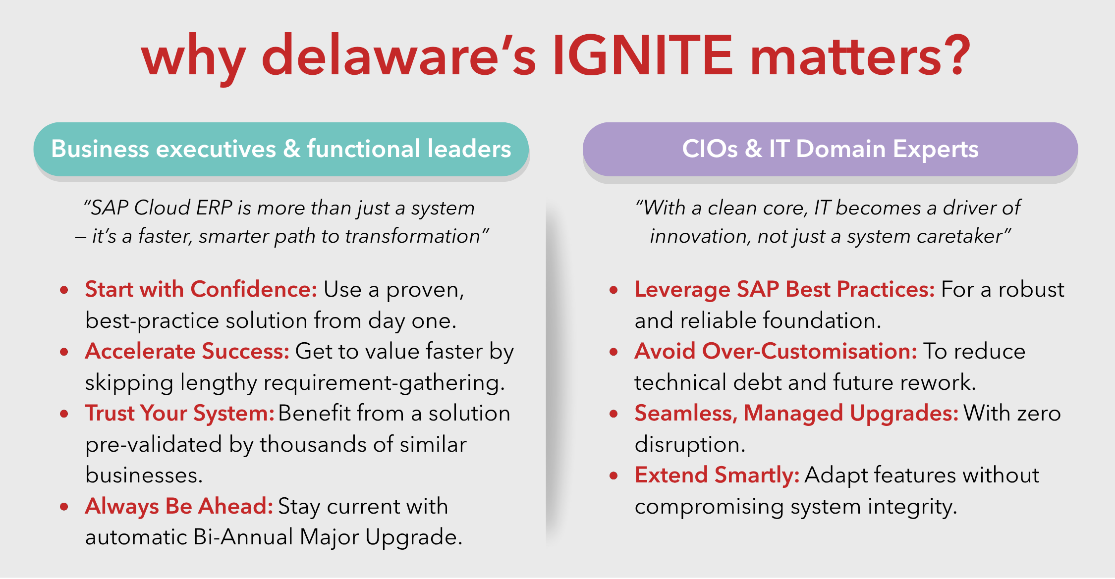 Transform your business with IGNITE — delaware’s fast-track SAP Cloud ERP solution designed for speed, scalability, and simplicity. Whether you're a growing SME or a complex enterprise, IGNITE delivers a clean-core ERP foundation aligned with SAP best practices and government grant-readiness.