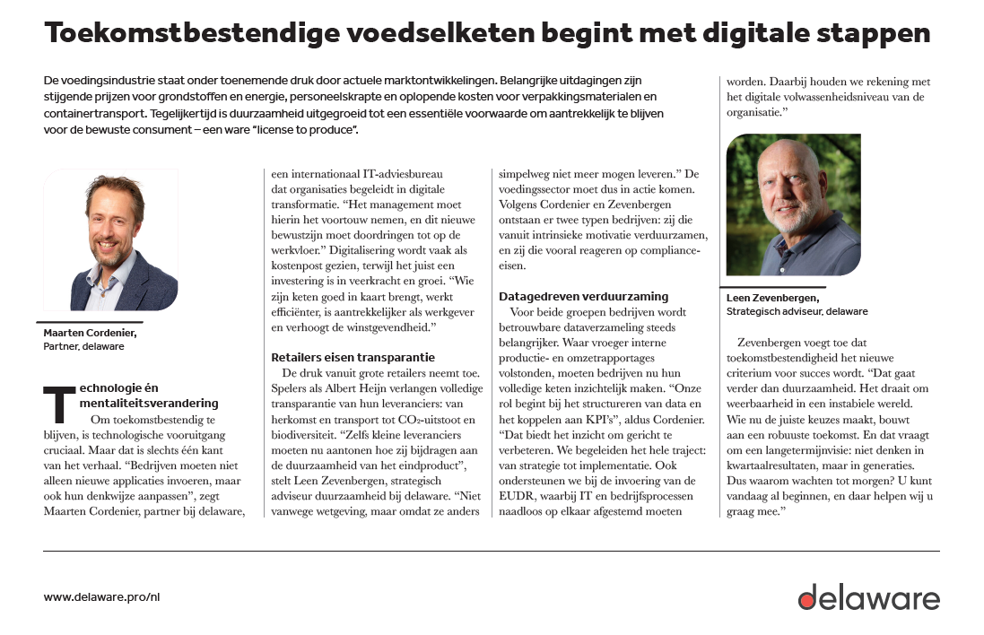 De voedingsindustrie staat onder toenemende druk: stijgende grondstofprijzen, personeelstekorten en nieuwe duurzaamheidswetgeving zetten bedrijven aan tot actie. In Future of AgriFood, bijlage van Het Financieele Dagblad (editie september 2025), delen Maarten Cordenier en Leen Zevenbergen hun visie op hoe digitalisering de voedselketen toekomstbestendig maakt.